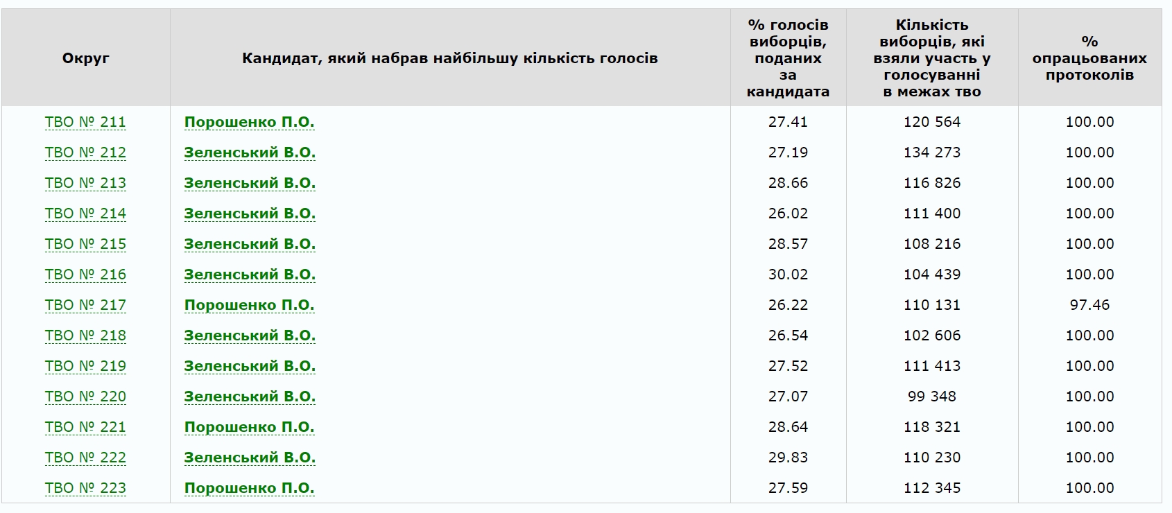 Подсчет голосов еще не 100%-ный, но существенные изменения не произойдут. Так, по состоянию на вечер вторника, 2 апреля, в Киеве до конца не подсчитали голоса избирателей №217 избирательного округа (97.46% обработанных бюллетеней по состоянию на 2 апреля). В целом же в столице осталось досчитать 0,19% бюллетеней.