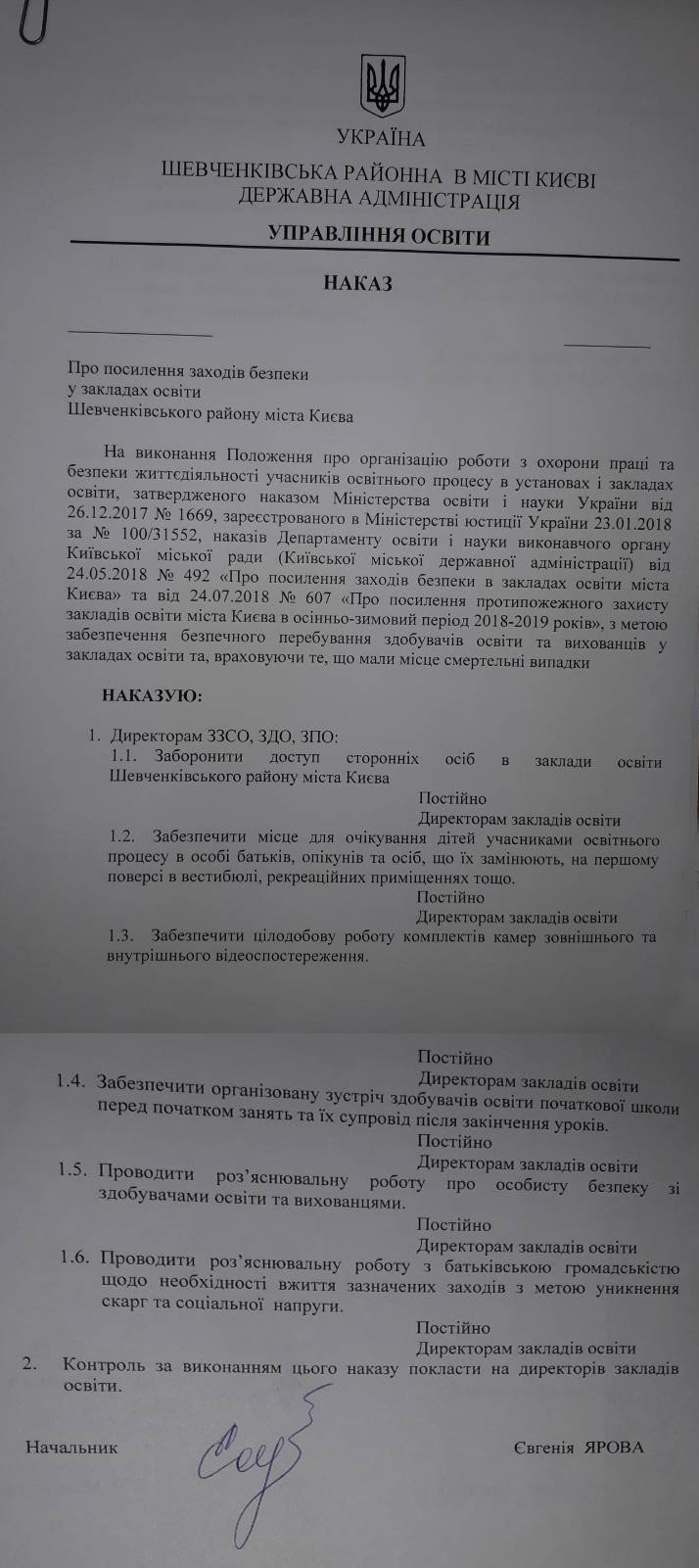 директорам школ, детских садиков запретить доступ сторонних лиц в учреждения образования Шевченковского района г. Киев;обеспечить место для ожидания детей участниками образовательного процесса в лице родителей и лиц, которые их заменяют на первом этаже вестибюлей, рекреационных помещений и т.п;обеспечить круглосуточную работу комплектов внешнего и внутреннего видеонаблюдения;обеспечить организованную встречу учащихся перед началом занятий и сопровождать их после окончания уроков;проводить разъяснительную работу про безопасность с учащимися;проводить разъяснительную работу с родителями о необходимости принятия указанных мер с целью недопущения жалоб и социального напряжения.